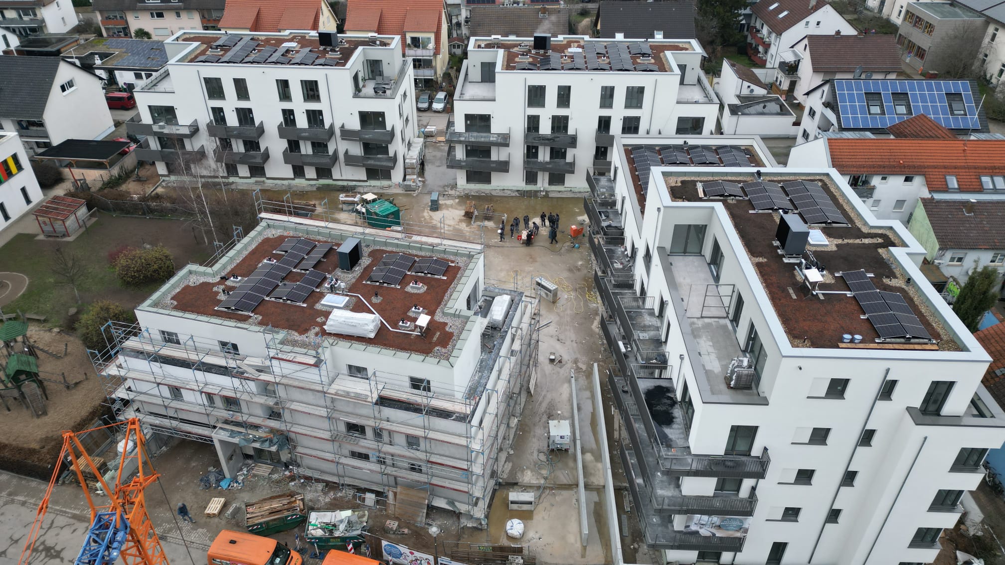 Rund um eine grüne Mitte gruppieren sich fünf Gebäude in warmen Sandtönen. Moderne Eigentumswohnungen mit 2 bis 4 Zimmern, allesamt ausgestattet mit privaten Außenbereichen zur grünen Quartiersmitte. Hier erwartet Sie Ihr komfortables neues Zuhause inmitten einer städtischen Umgebung und lebendigen Nachbarschaft.